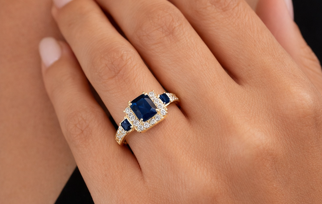 Halle’s ring has been described as a Retro-era design set in yellow gold, featuring a round diamond center with accent diamonds and a bold halo-like frame of step-cut sapphires. In other words: it’s structured, architectural, and totally timeless. Other jewelry experts have also noted the ring’s “one-of-a-kind” feel, emphasizing its vintage styling, yellow-gold warmth, and the way the surrounding stones create a distinctive, story-driven design.